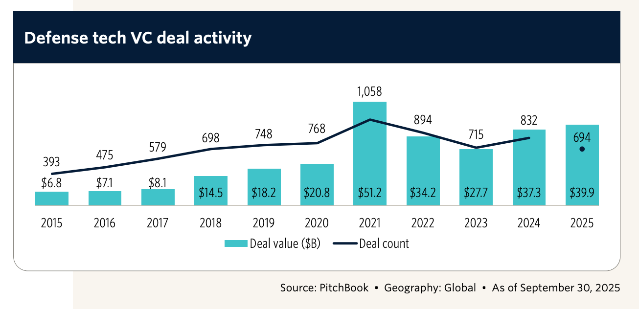 According to Pitchbook, as of September 30, 2025, venture capitalists (VCs) have invested almost $40B into national security focused companies in 2025, compared to $37.9B invested in all of 2024. Investor excitement for the sector shows no signs of slowing – 11 national security unicorns were minted in 2025 alone.