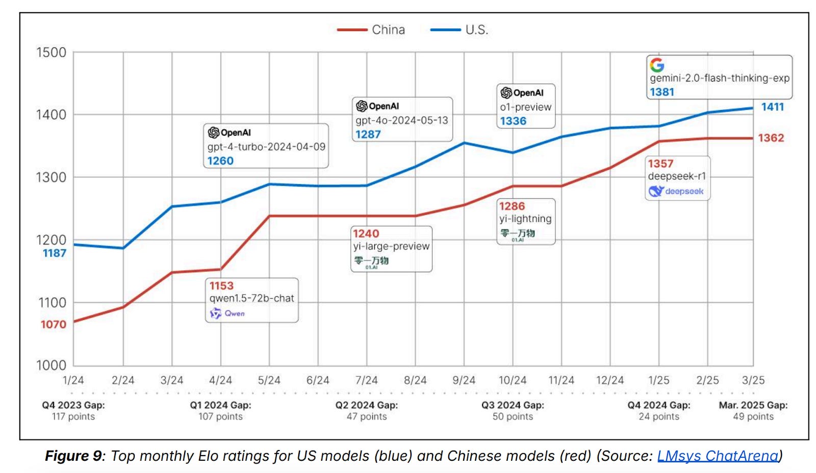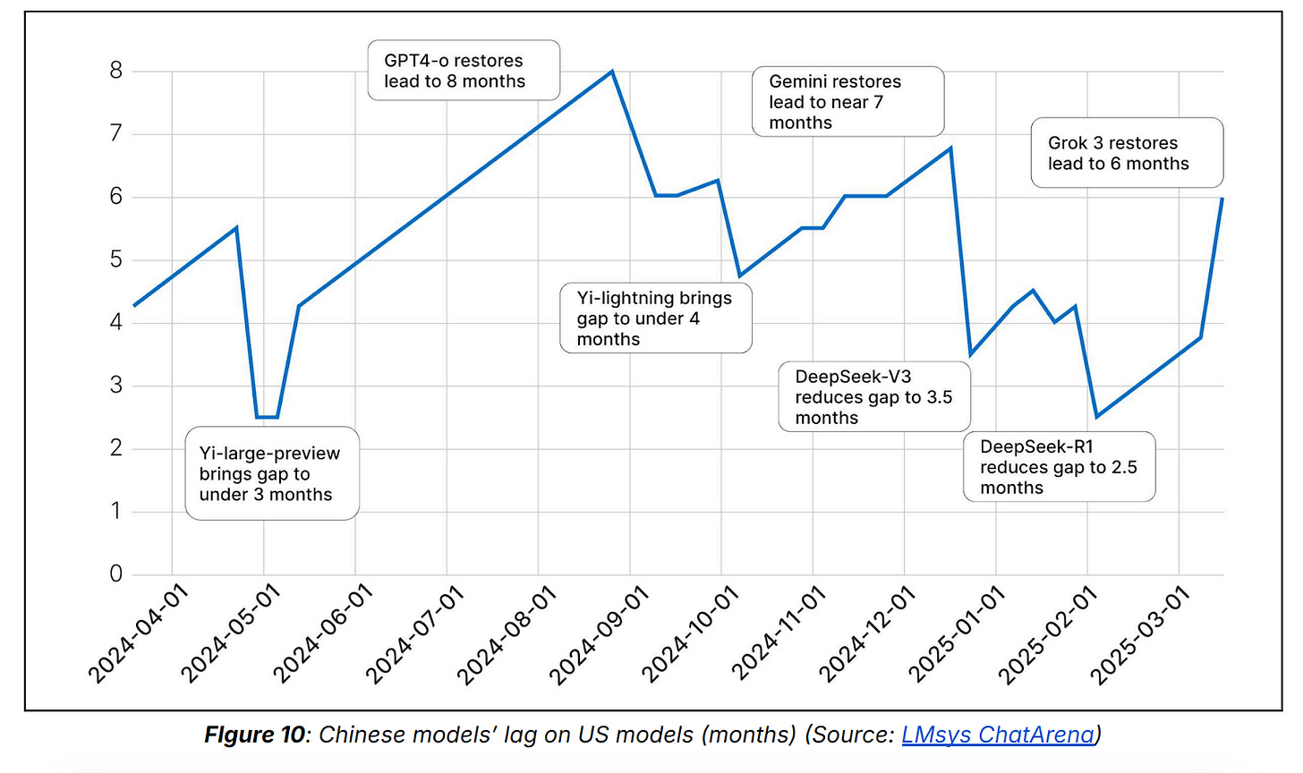 In 2024, experts estimated that Chinese AI researchers were about 6-12 months behind U.S. AI researchers. However, experts now believe the gap has narrowed significantly over the past year due to model releases from DeepSeek (R1 and V2), Alibaba (Qwen), 01.AI (Yi), and Moonshot AI (Kimi). Now, researchers say Chinese AI researchers are just 3-6 months behind US researchers.