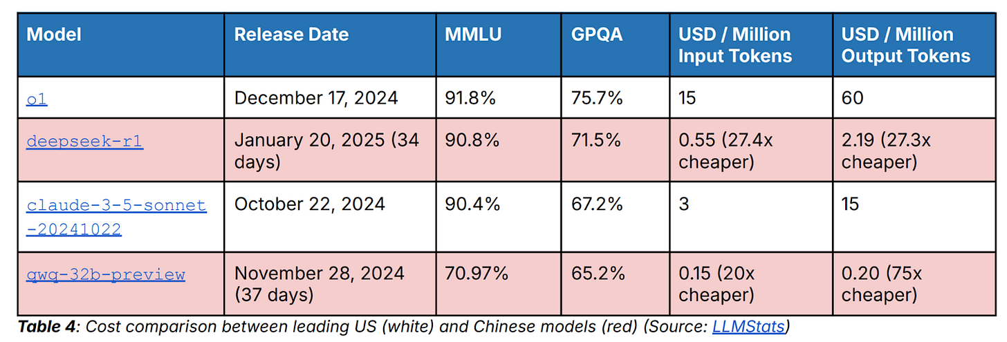 The AI price war in China is likely worse than in the U.S. because the U.S. GenAI market is dominated by a small number of cutting-edge companies (OpenAI, Anthropic, and Google) that release differentiated frontier models with increasingly better performance. In contrast, Chinese companies tend to release lagging-edge products that are not differentiated from American frontier models or other Chinese models, making it necessary to compete on price. Additionally, Chinese AI researchers are incentivized to develop cheap, efficient models due to U.S. export control-imposed hardware constraints. For example, DeepSeek’s team had to optimize model training and inference to make the most of lower-end hardware, which led to the development of an extremely low-cost model (DeepSeek’s R1 model is about 50% cheaper than OpenAI’s o3-mini, which has similar performance). This extreme focus on low price positions China well to ultimately diffuse AI, as access to cheap models lowers the barrier to entry for adopting AI.