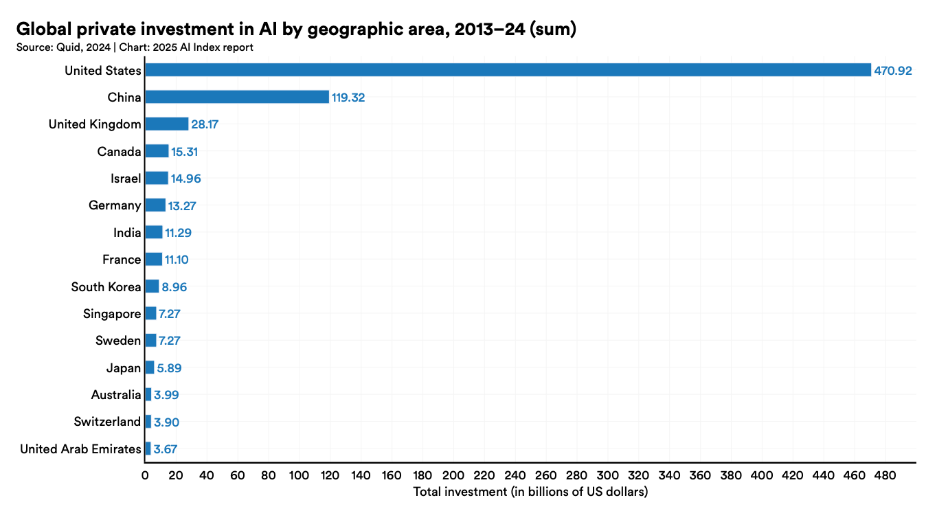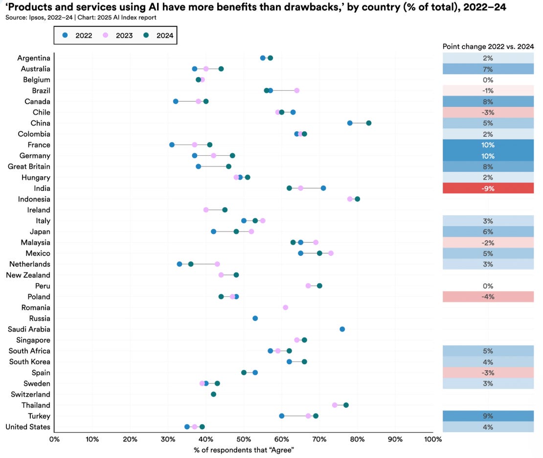 Further, simply “adopting AI,” as any large enterprise is eager to do, does not necessarily constitute successfully diffusing it. “Winning the AI race” is not merely using more AI but translating that use into economic and military advantage. This distinction makes quantifying the AI race even harder. Other metrics may indicate or predict successful AI adoption, like the number of AI integration-related job postings, programs for developing talent that know how to adopt AI, etc. A Stanford 2025 HAI report states that the percentage of the population in China that sees AI uses as “more beneficial than harmful” is more than double that in the U.S. Higher trust in AI may lead to quicker adoption.