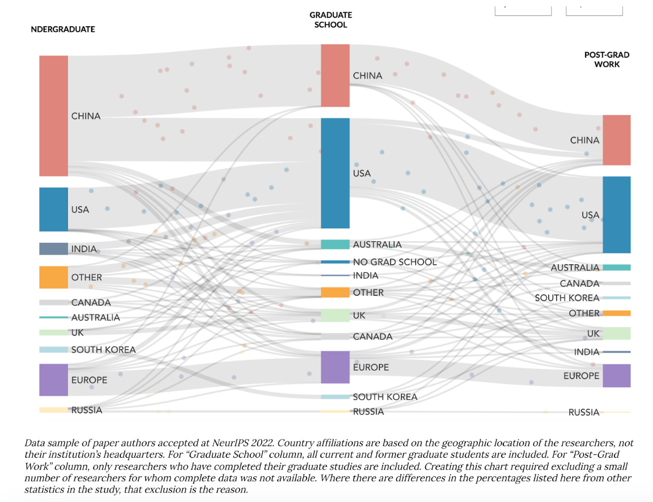 Having a strong talent base is needed to develop and diffuse AI throughout the economy. Many studies of China’s AI industry focus on top-tier expert AI talent. The Chinese undergraduates who pursue graduate work in AI, its most talented students, often leave to pursue that work in the U.S. Despite having far more undergraduates in AI, China has far fewer graduate students and post-grads than the U.S. The U.S. is clearly the most attractive place for AI experts.